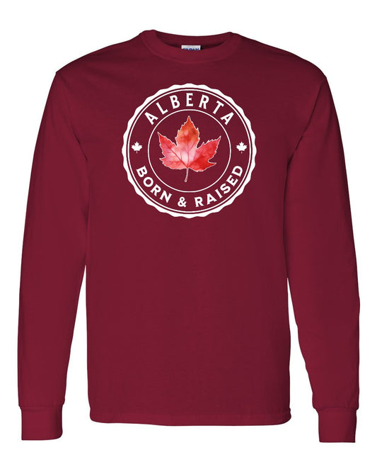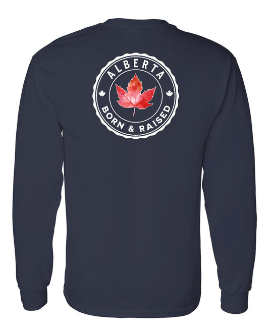 Born And Raised Alberta Left Chest and Back Long Sleeve - Gildan Canada (sewn Internationally)